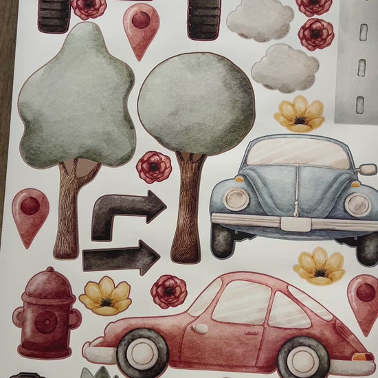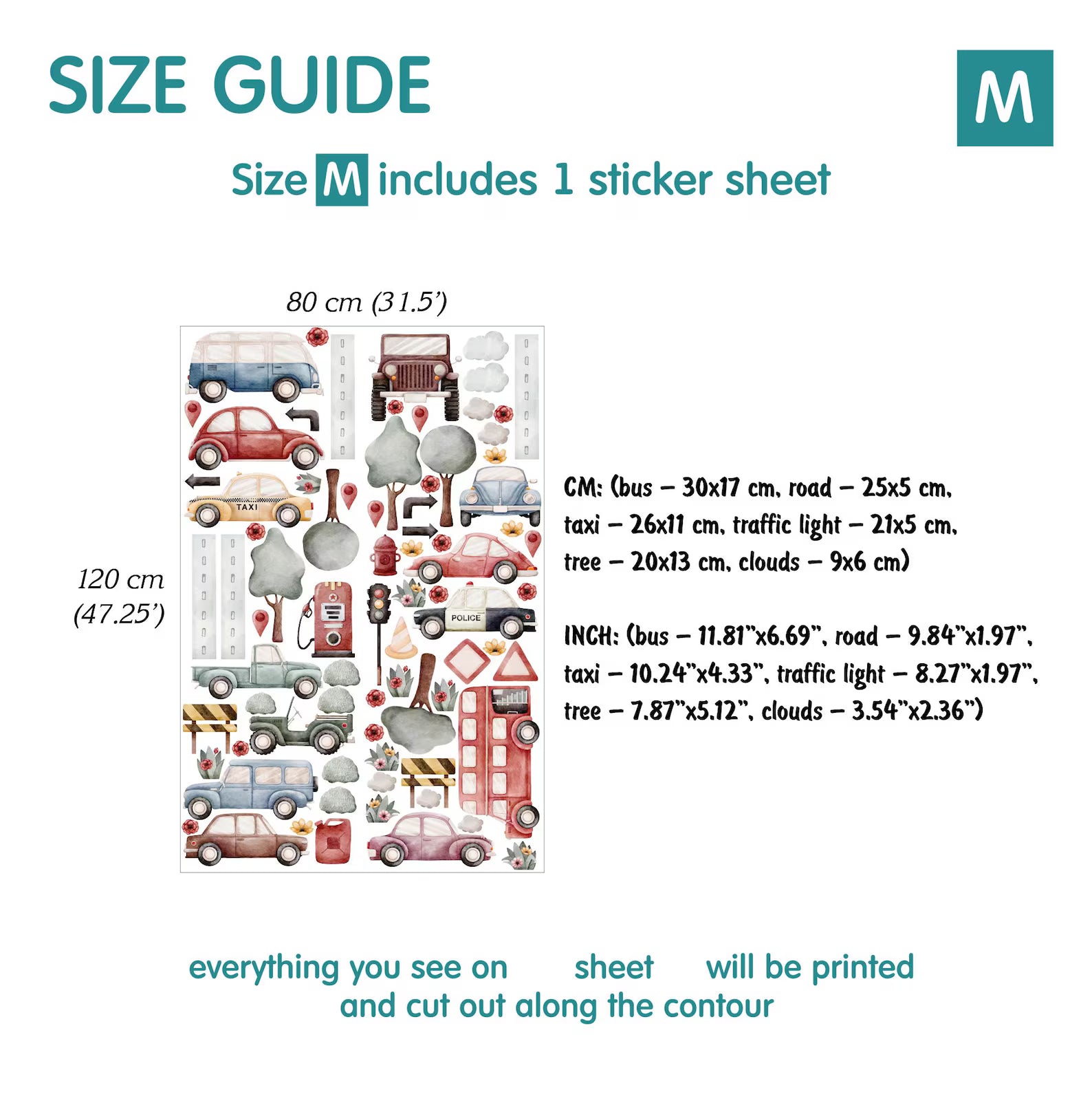 INCH: (bus β 9.84"x5.12", road β 7.87"x1.18", taxi β 7.87"x3.54", traffic light β 6.30"x1.57", tree β 6.30"x4.72", clouds β 2.76"x1.57")