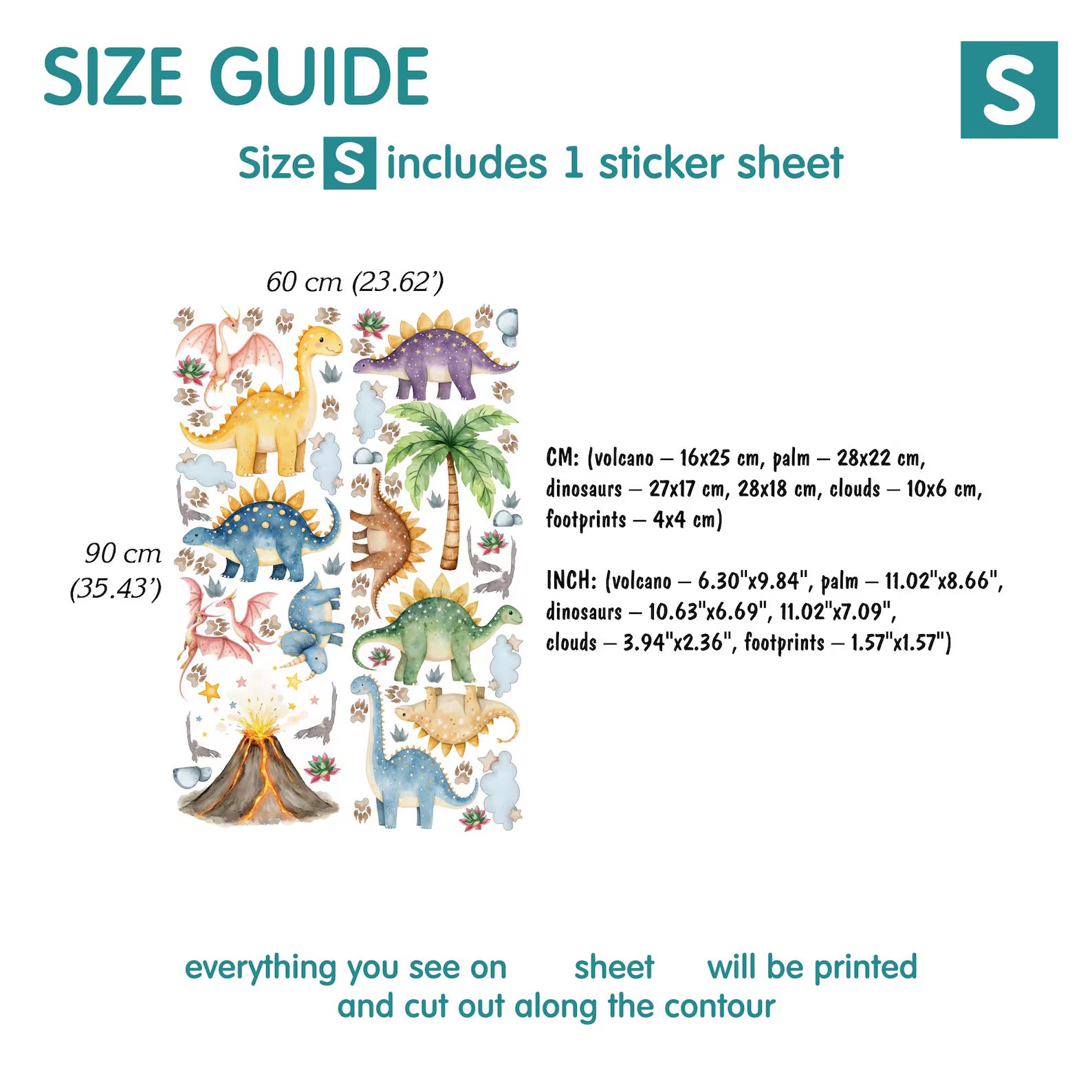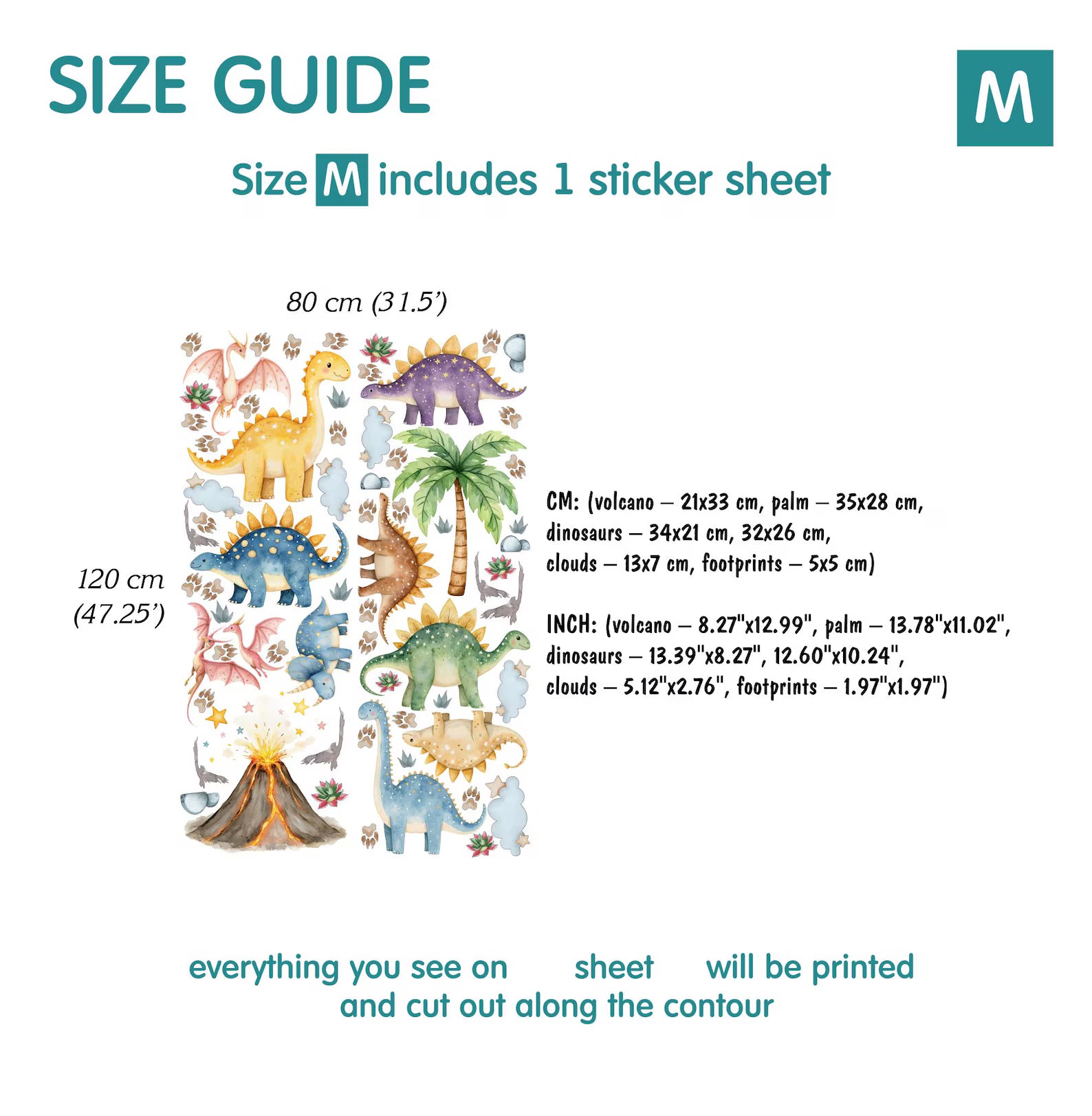 INCH: (volcano β 11.81"x20.08", palm β 20.87"x16.54", dinosaurs β 12.60"x20.08", 18.90"x14.17", clouds β 7.87"x3.94", footprints β 2.76"x2.76")
