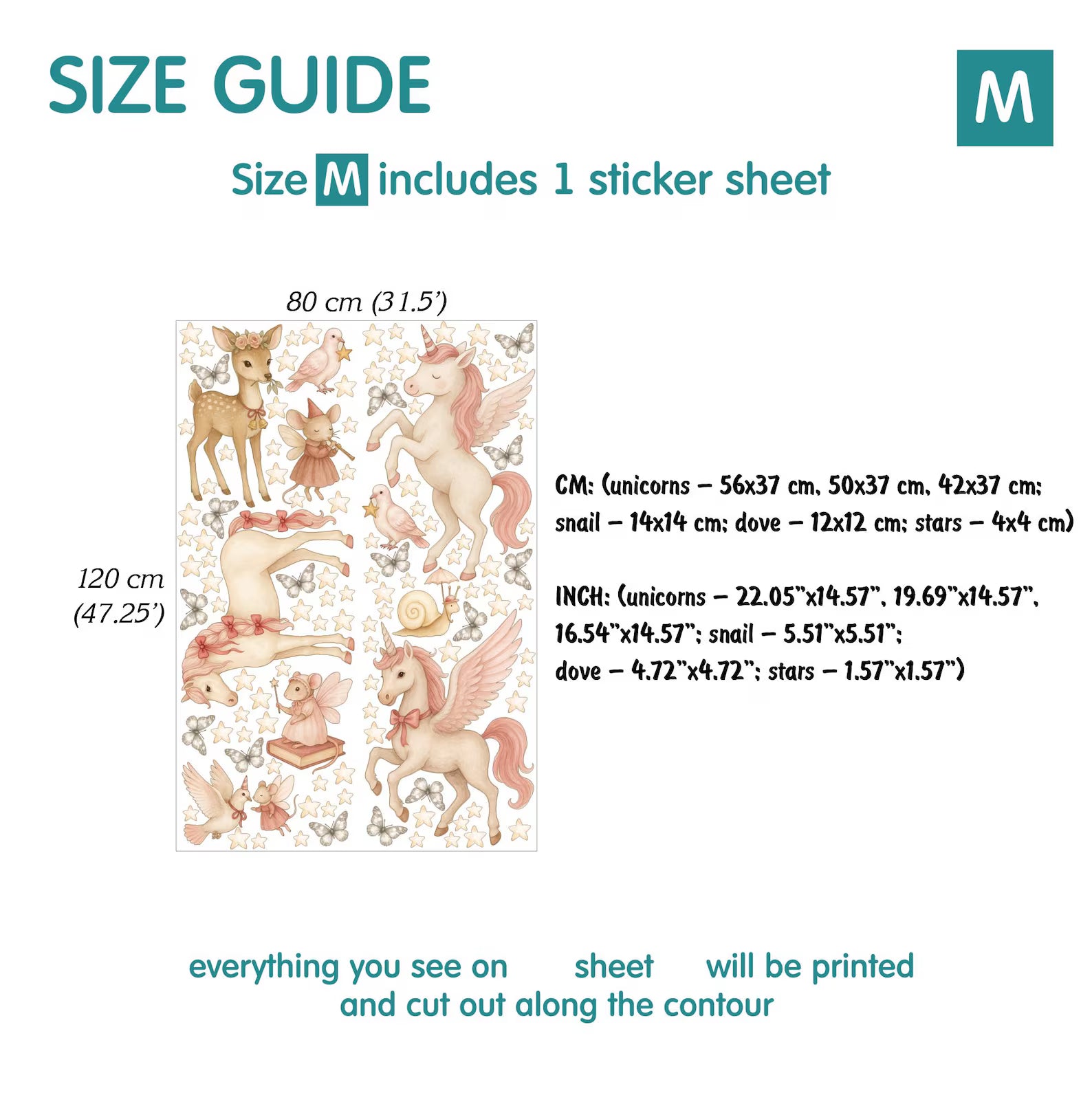 INCH: (unicorns β 31.50"x22.05", 29.92"x21.65", 25.98"x21.65"; snail β 8.66"x8.66"; dove β 7.87"x7.87"; stars β 2.76"x2.76")