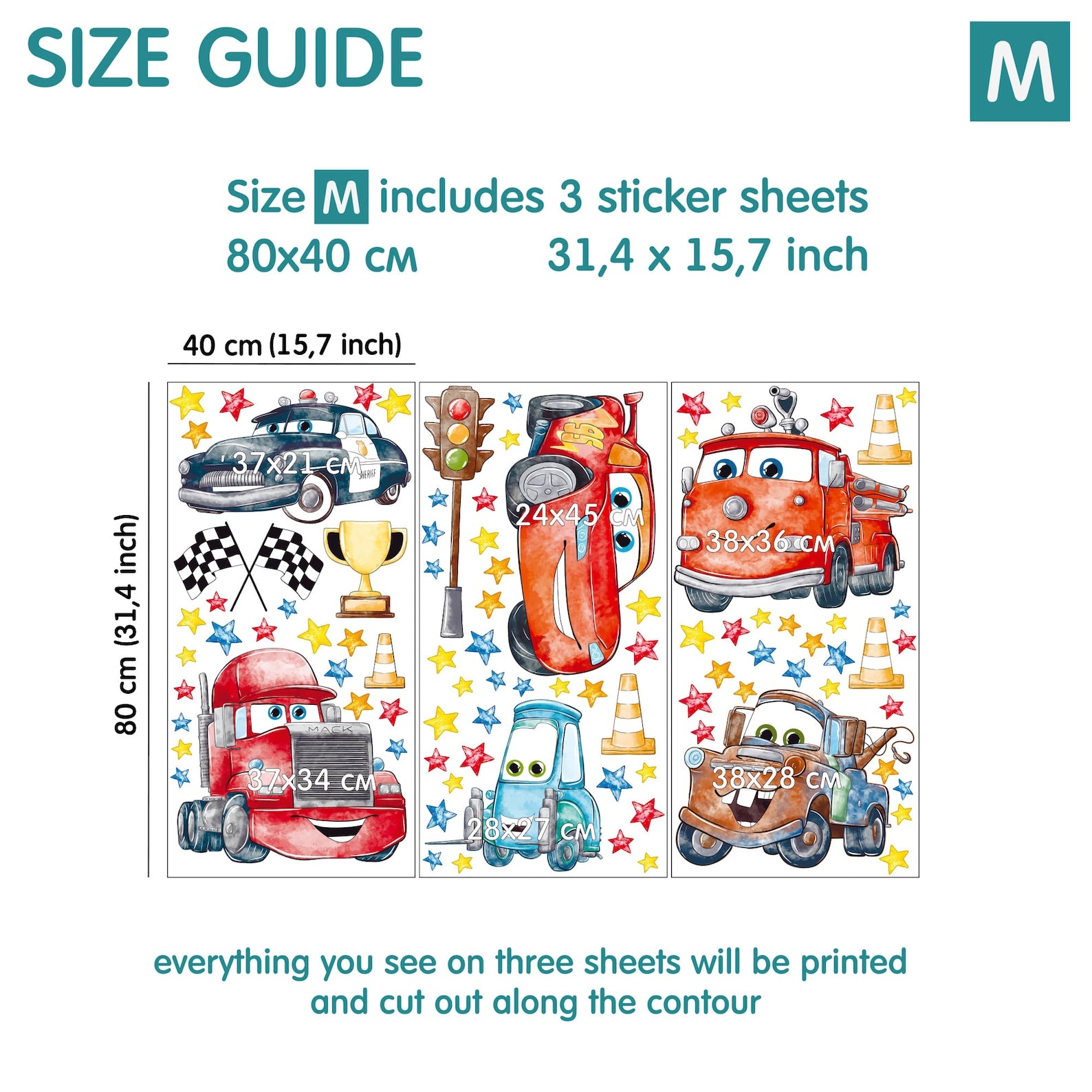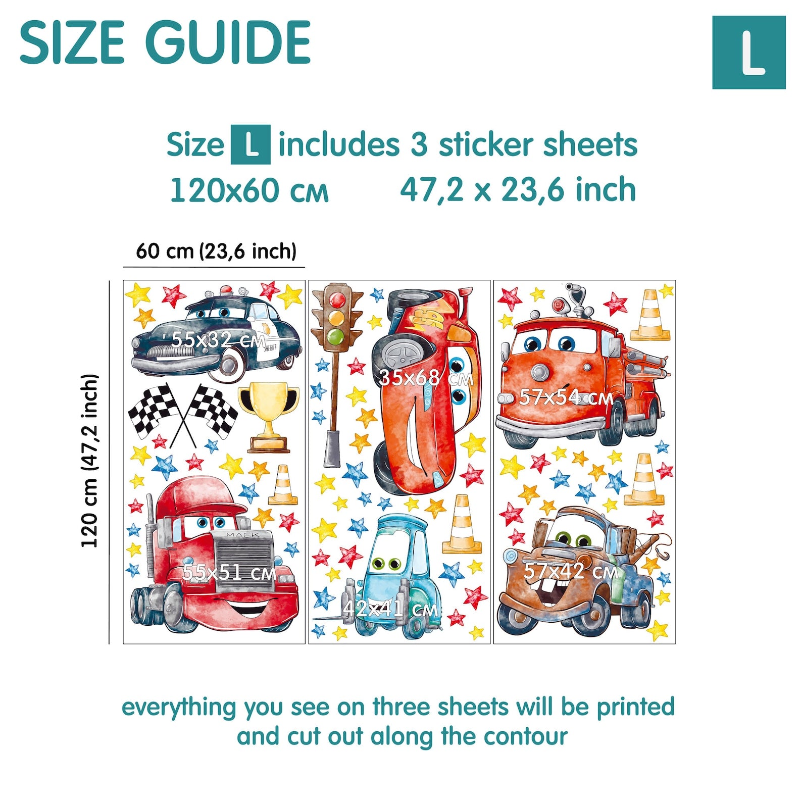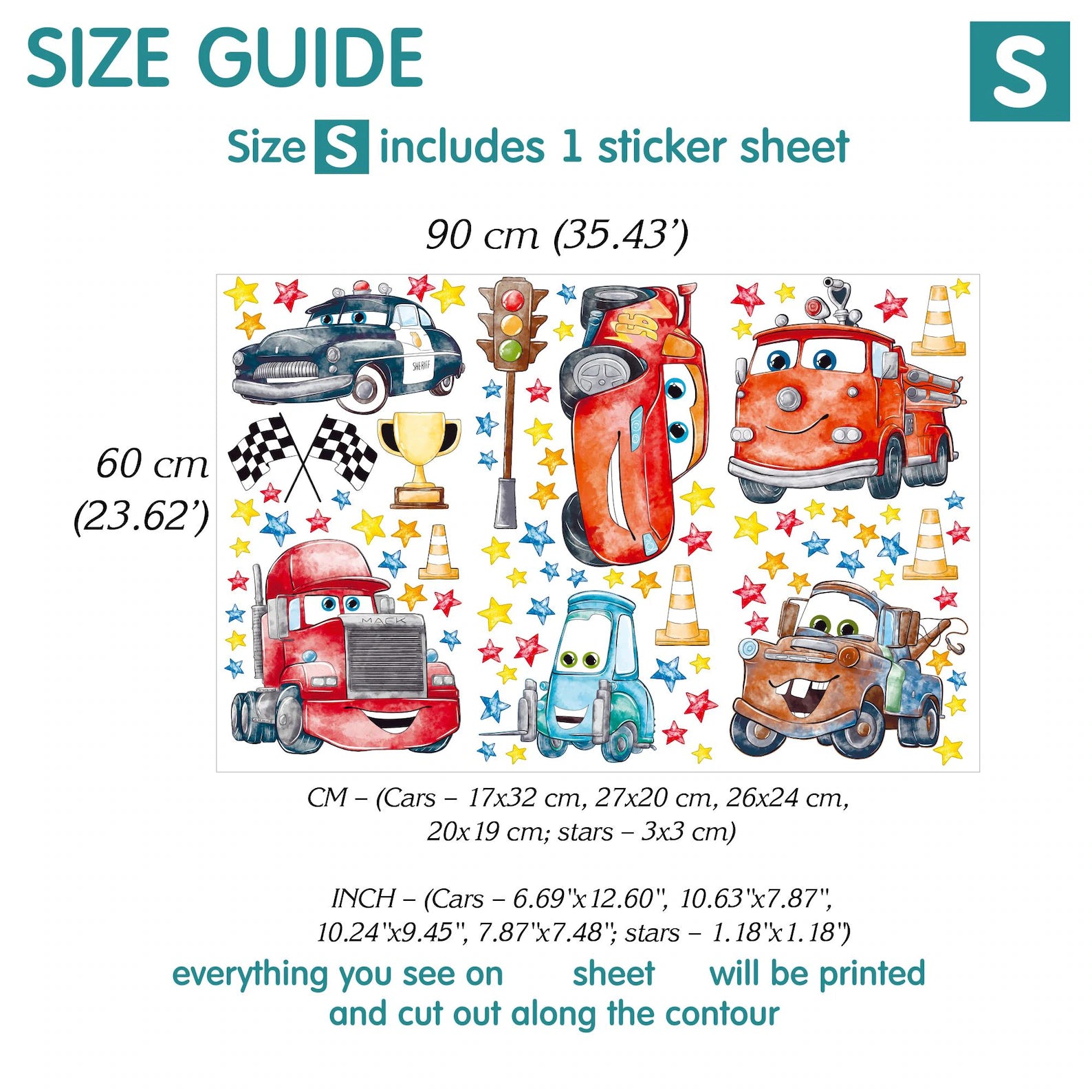 INCH โ (Cars โ 6.69"x12.60", 10.63"x7.87", 10.24"x9.45", 7.87"x7.48"; stars โ 1.18"x1.18")