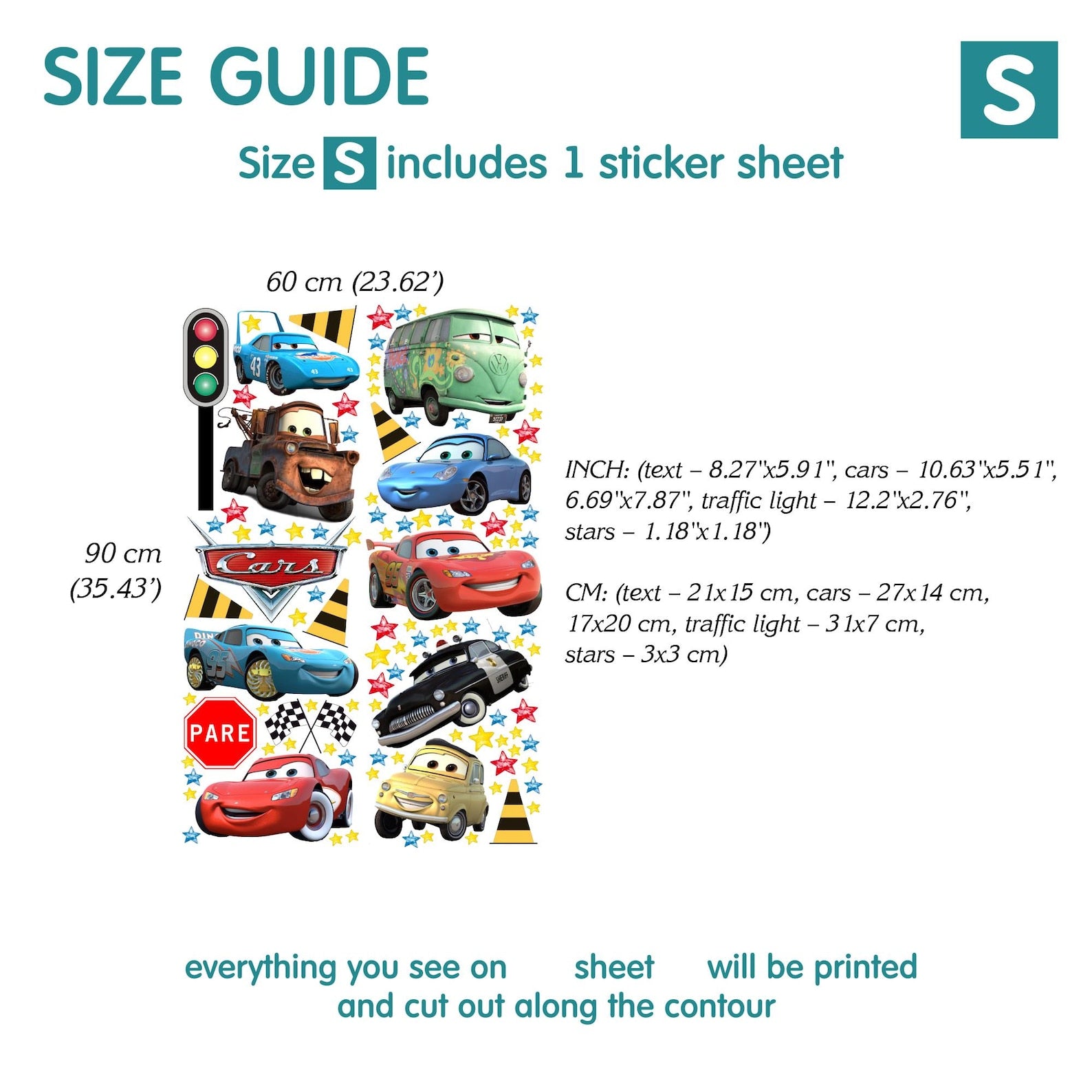 CM: (text β 46x27 cm, cars β 52x27 cm, 35x43 cm, traffic light β 60x15 cm, stars β 7x7 cm)