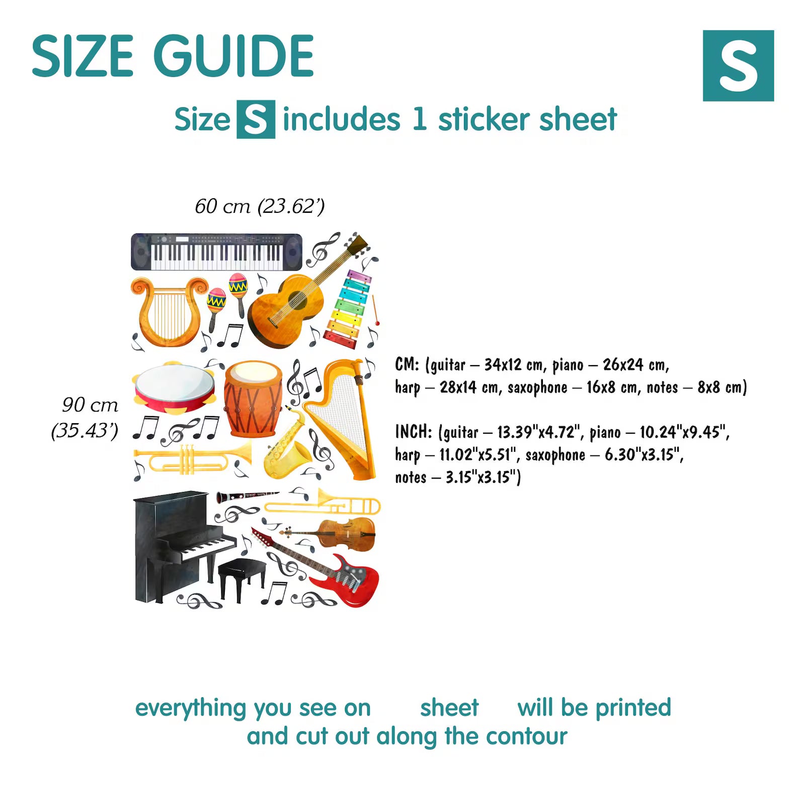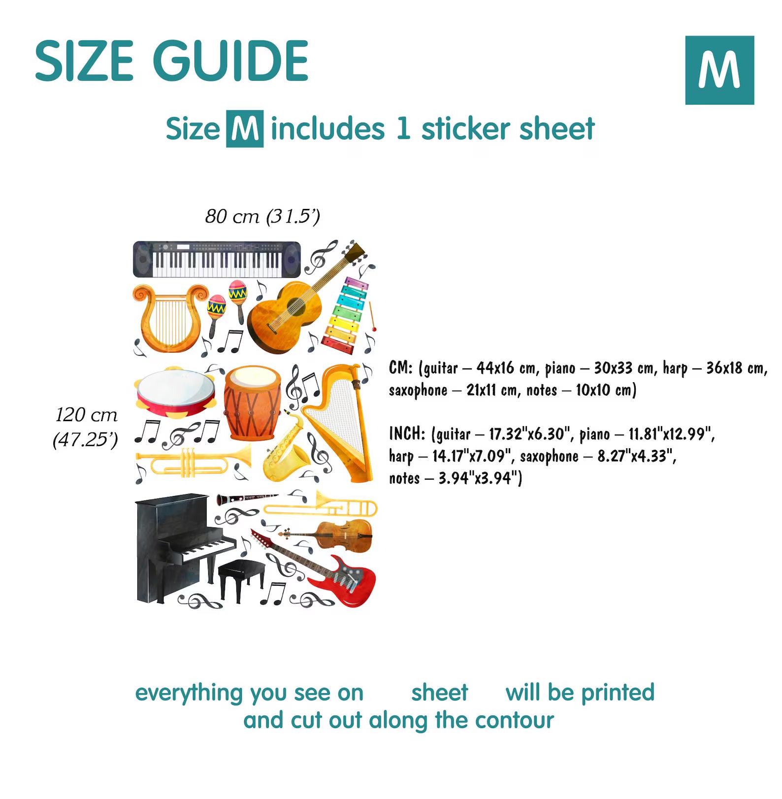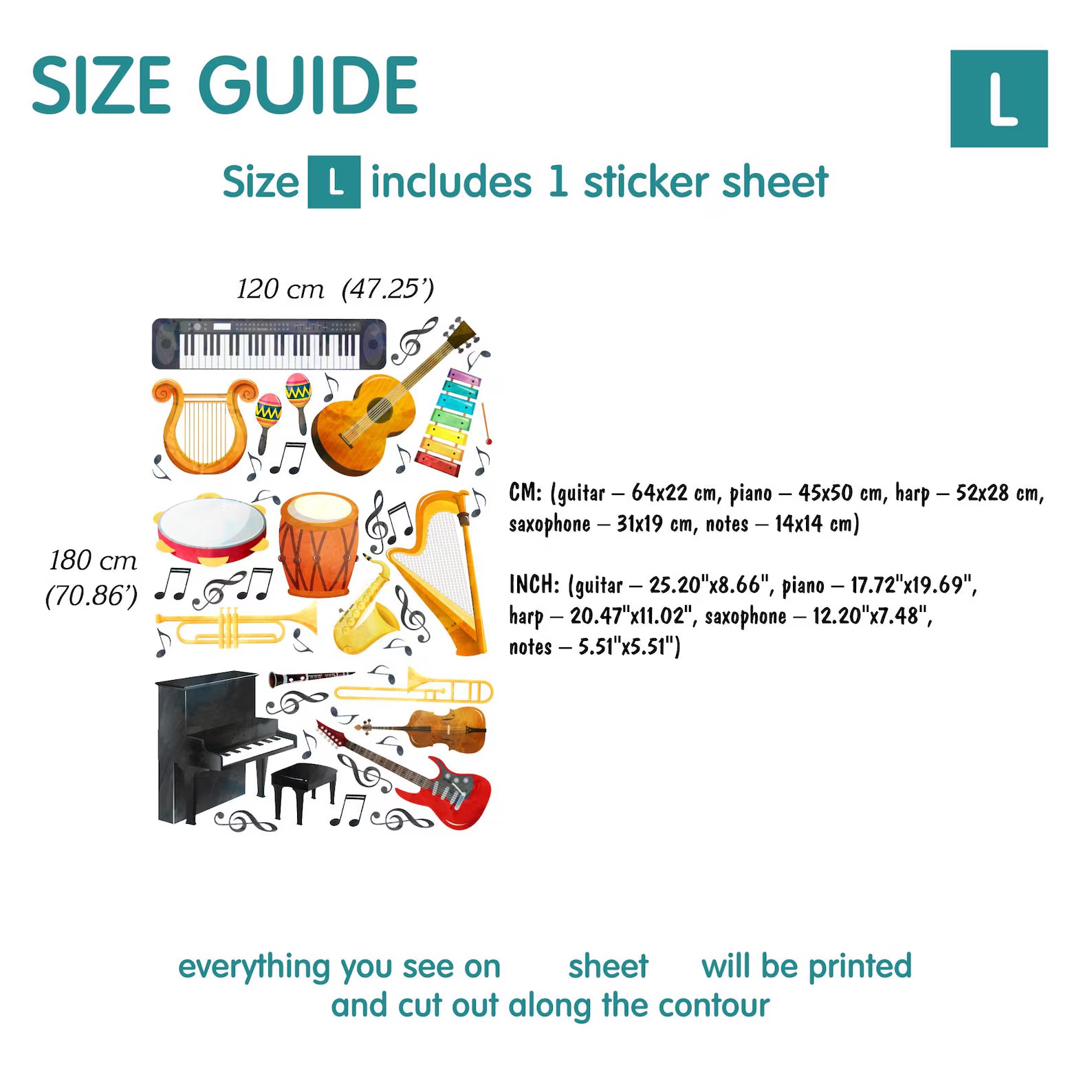 INCH: (guitar β 17.32"x6.30", piano β 11.81"x12.99", harp β 14.17"x7.09", saxophone β 8.27"x4.33", notes β 3.94"x3.94")