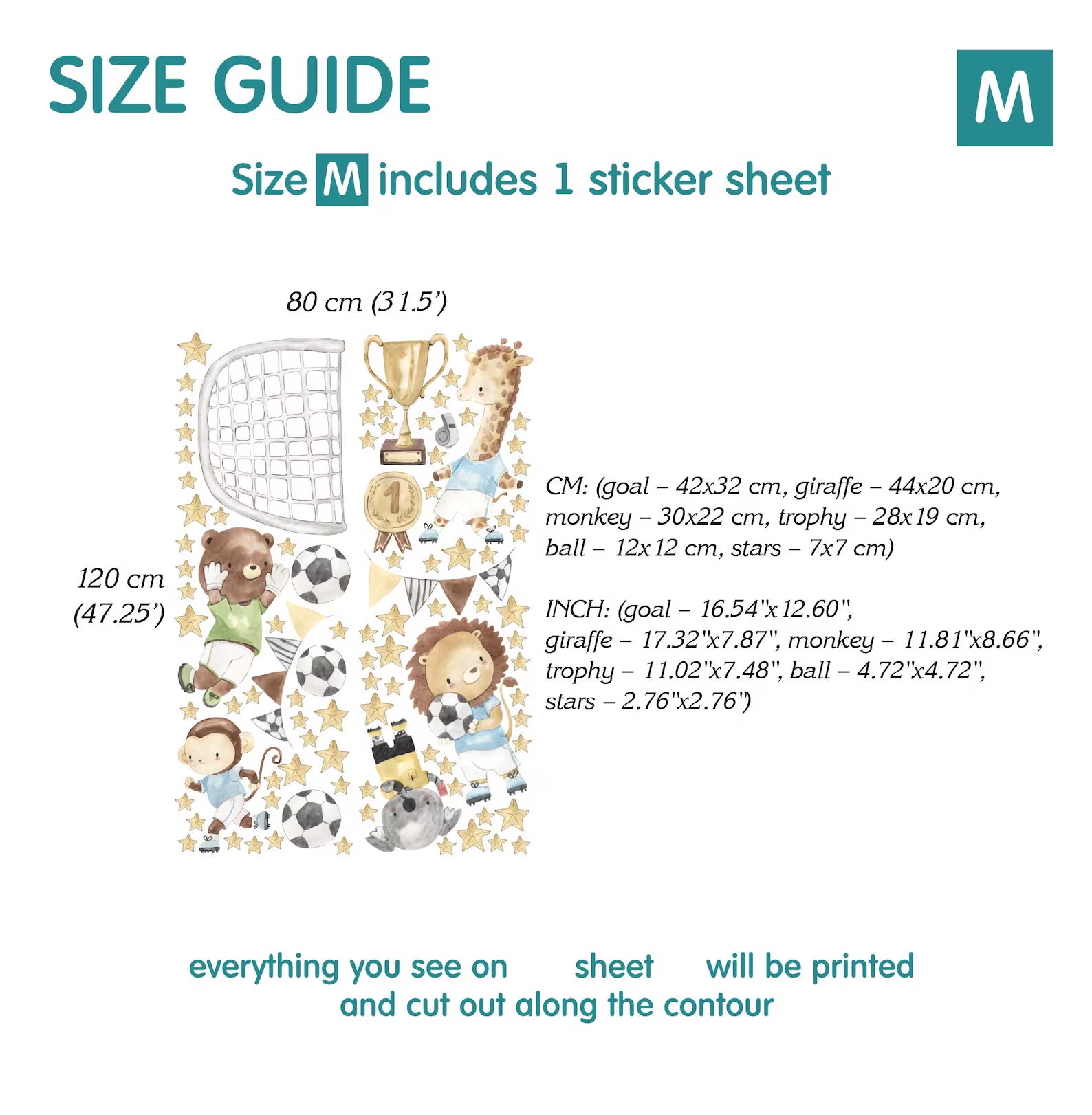 INCH: (goal β 24.80"x18.50", giraffe β 24.80"x11.81", monkey β 16.93"x13.39", trophy β 16.14"x11.02", ball β 6.69"x6.69", stars β 3.54"x3.54")