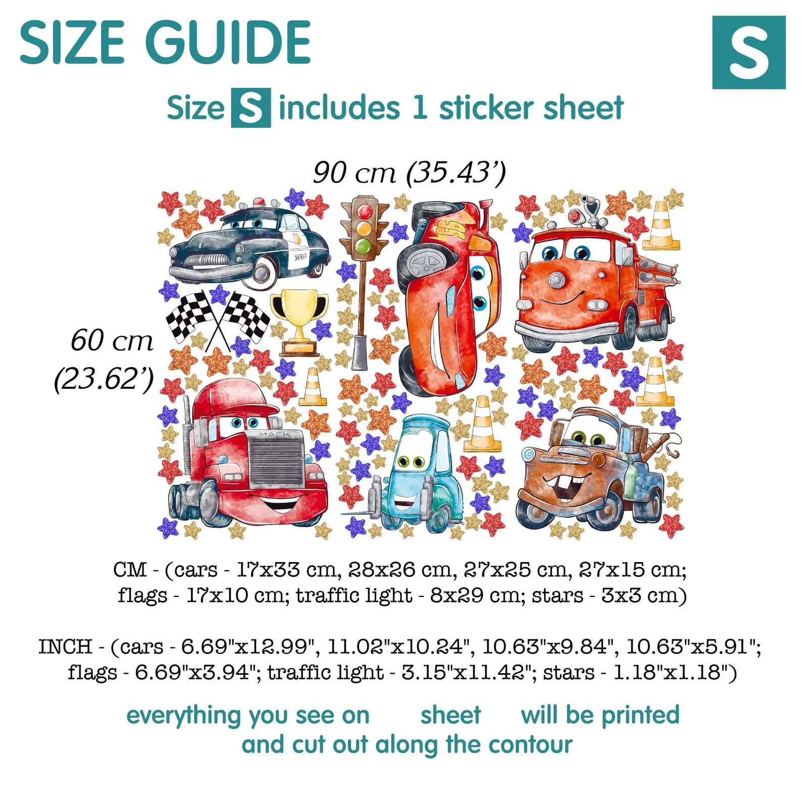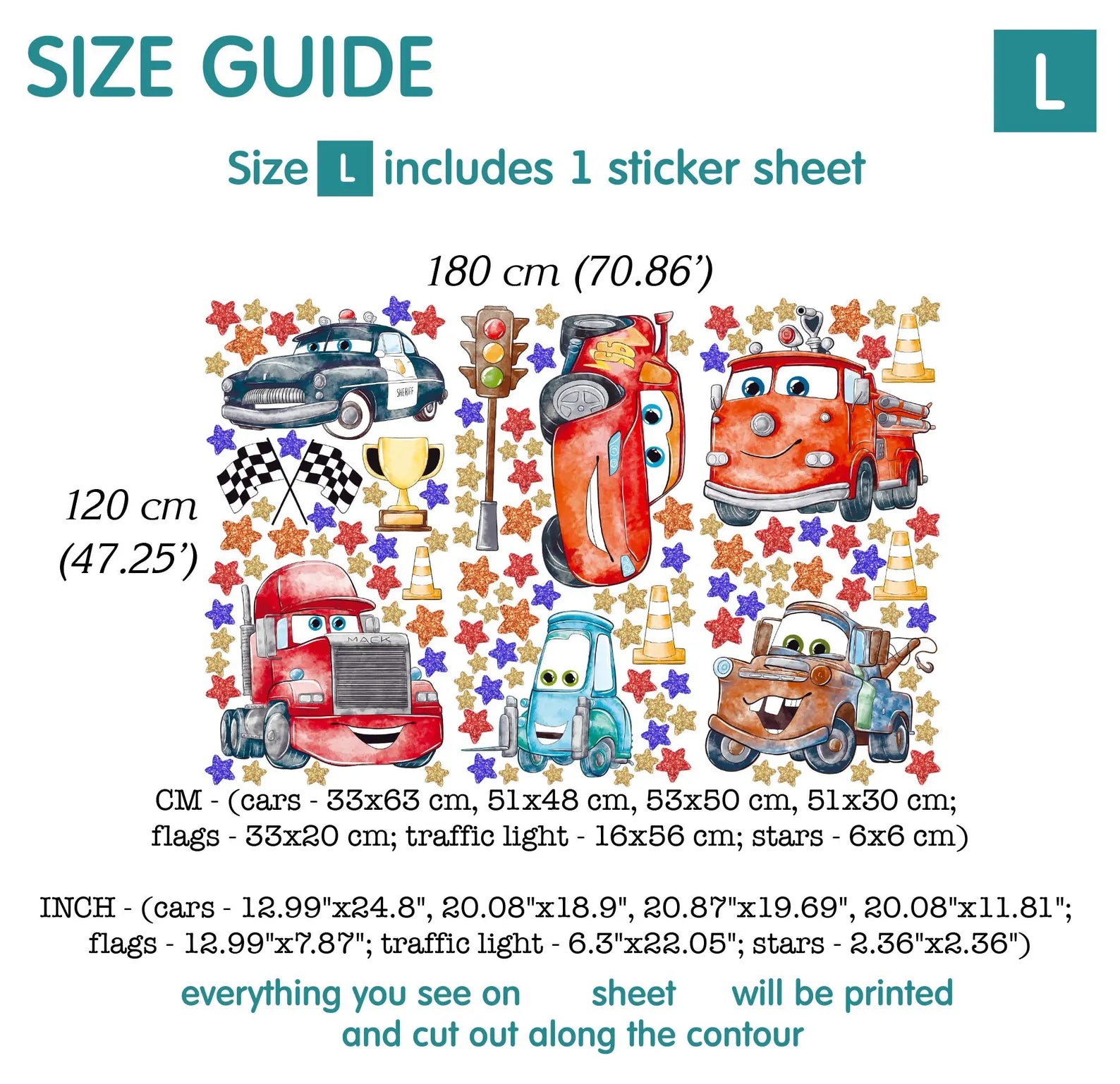 INCH - (cars - 12.99"x24.8", 20.08"x18.9", 20.87"x19.69", 20.08"x11.81"; flags - 12.99"x7.87"; traffic light - 6.3"x22.05"; stars - 2.36"x2.36")