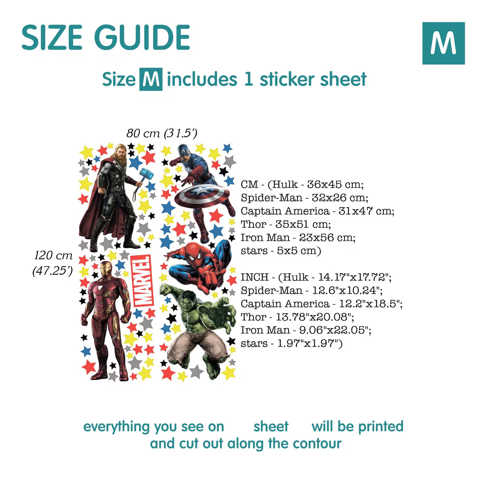 INCH - (Hulk - 11.02"x13.78"; Spider-Man - 9.84"x7.87"; Captain America - 9.45"x14.57"; Thor - 10.63"x15.75"; Iron Man - 7.09"x17.32"; stars - 1.57"x1.57")