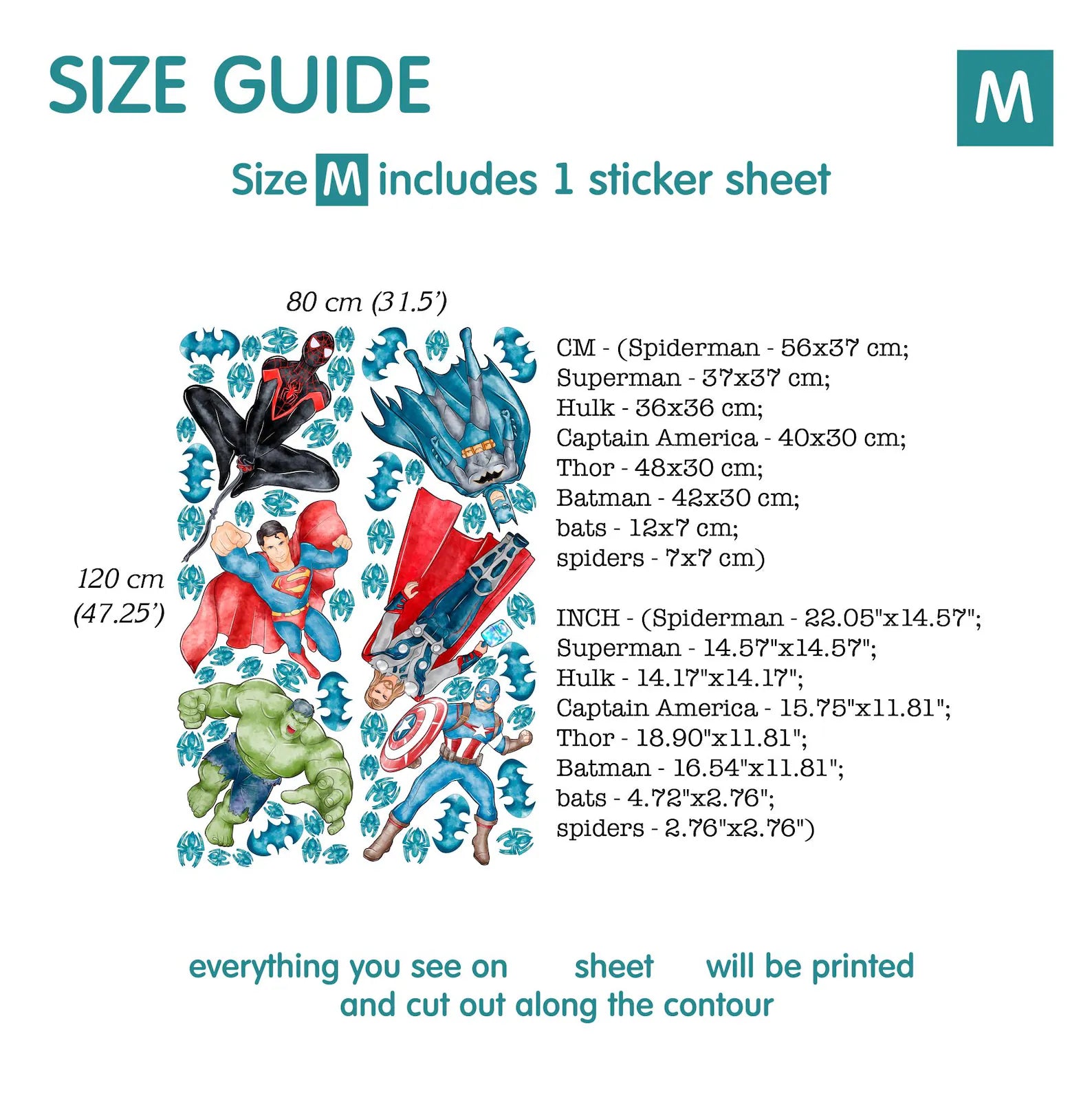 INCH - (Spiderman - 22.05"x14.57"; Superman - 14.57"x14.57"; Hulk - 14.17"x14.17"; Captain America - 15.75"x11.81"; Thor - 18.90"x11.81"; Batman - 16.54"x11.81"; bats - 4.72"x2.76"; spiders - 2.76"x2.76")